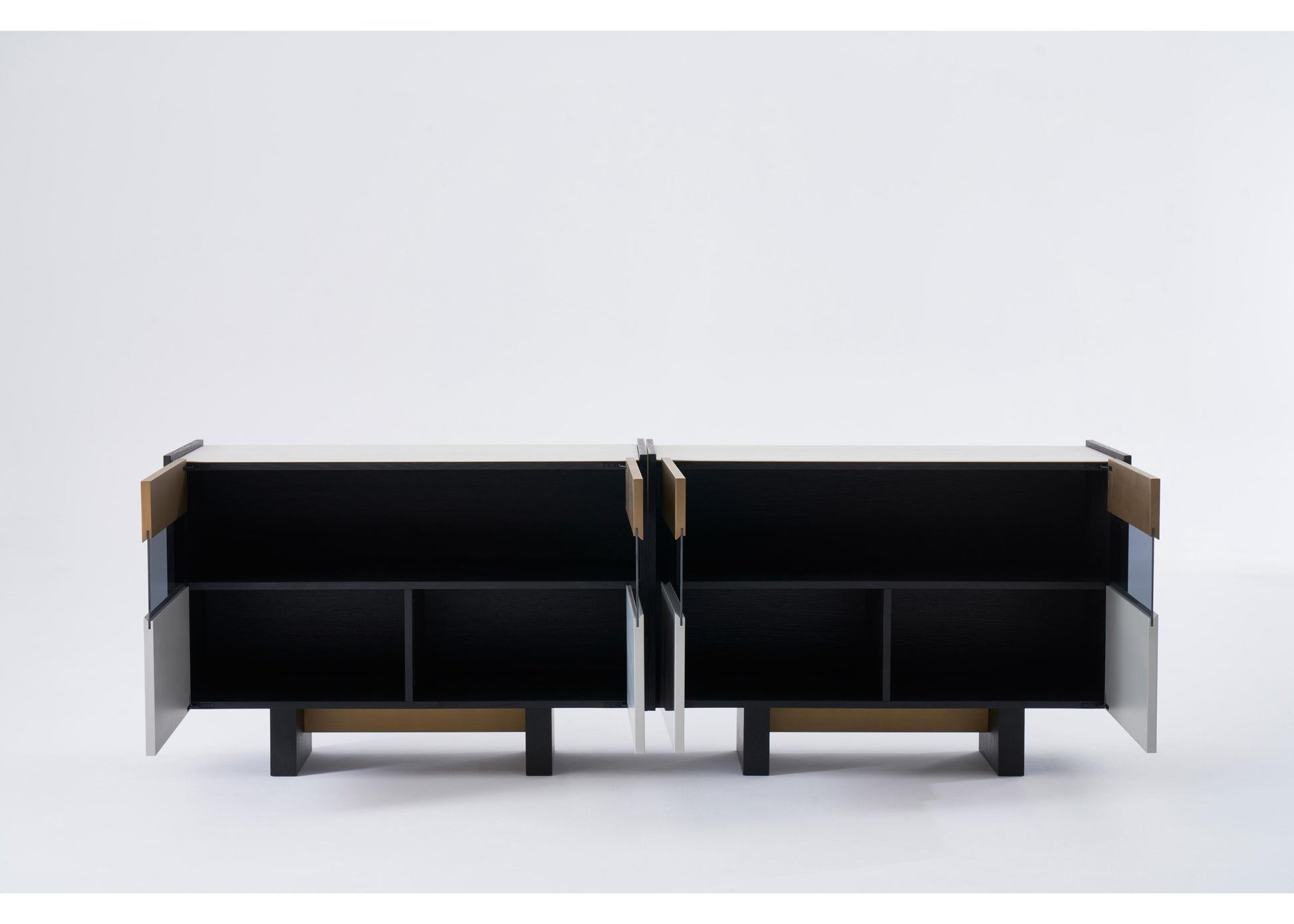 Eine Anrichte mit feinem Gleichgewicht zwischen Funktion und Design. Sie bringt Ordnung und Struktur in den Wohnraum. Material: Lackiertes Holz, Glastüren mit Spiegel, Akzente aus Messing