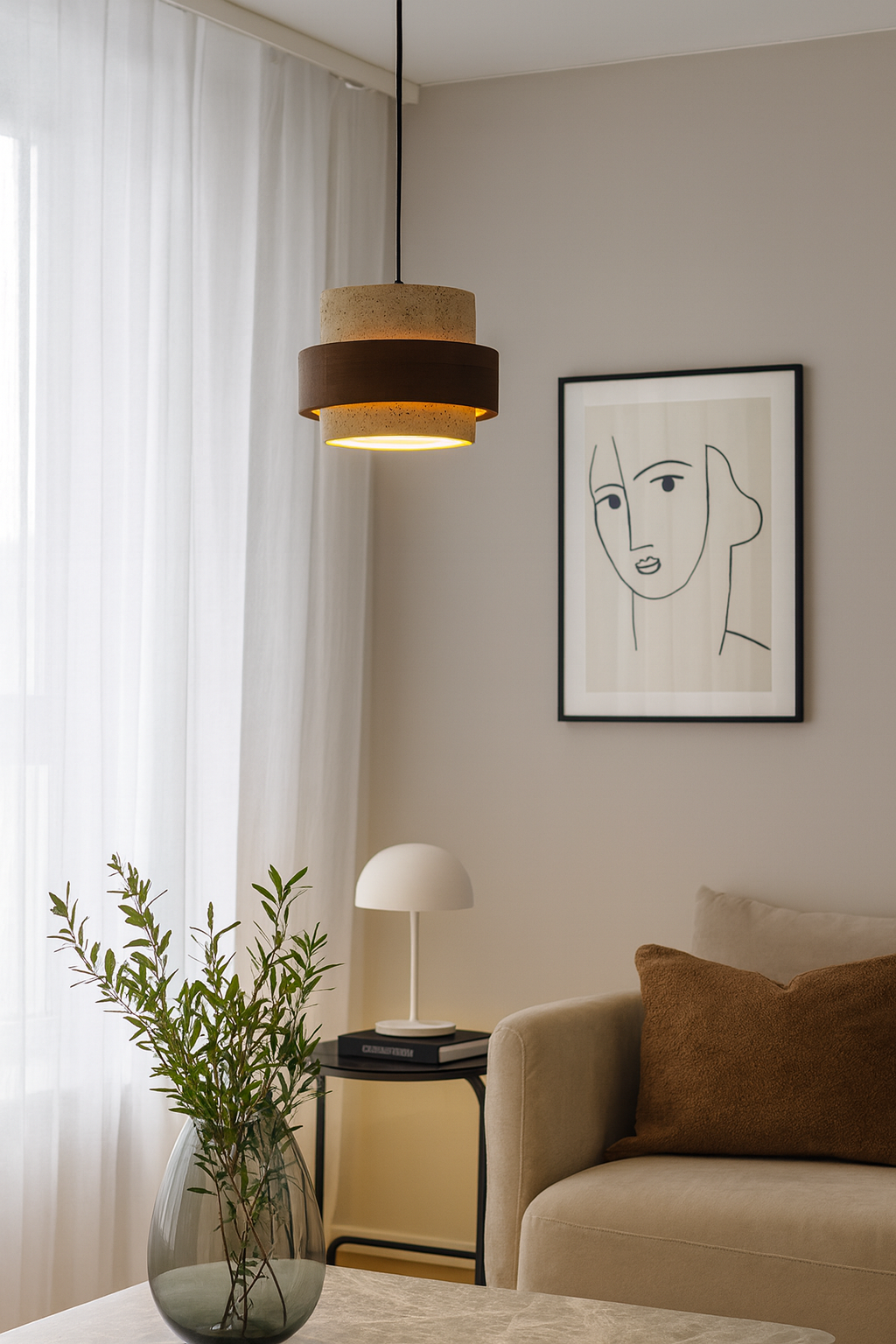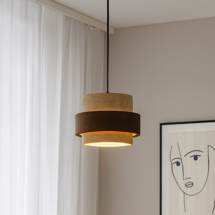 Ein klar strukturierter Pendelleuchte aus Travertin und Holz mit ausgewogenen Proportionen und reduzierter Formensprache. Gefertigt mit architektonischer Präzision und hochwertigen Materialien.
