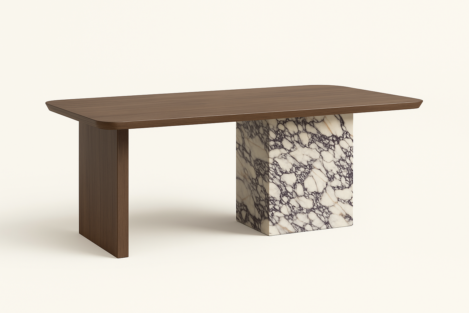 Farbe: Warme Nusstöne kombiniert mit cremefarbenem Marmor und violetten Adern