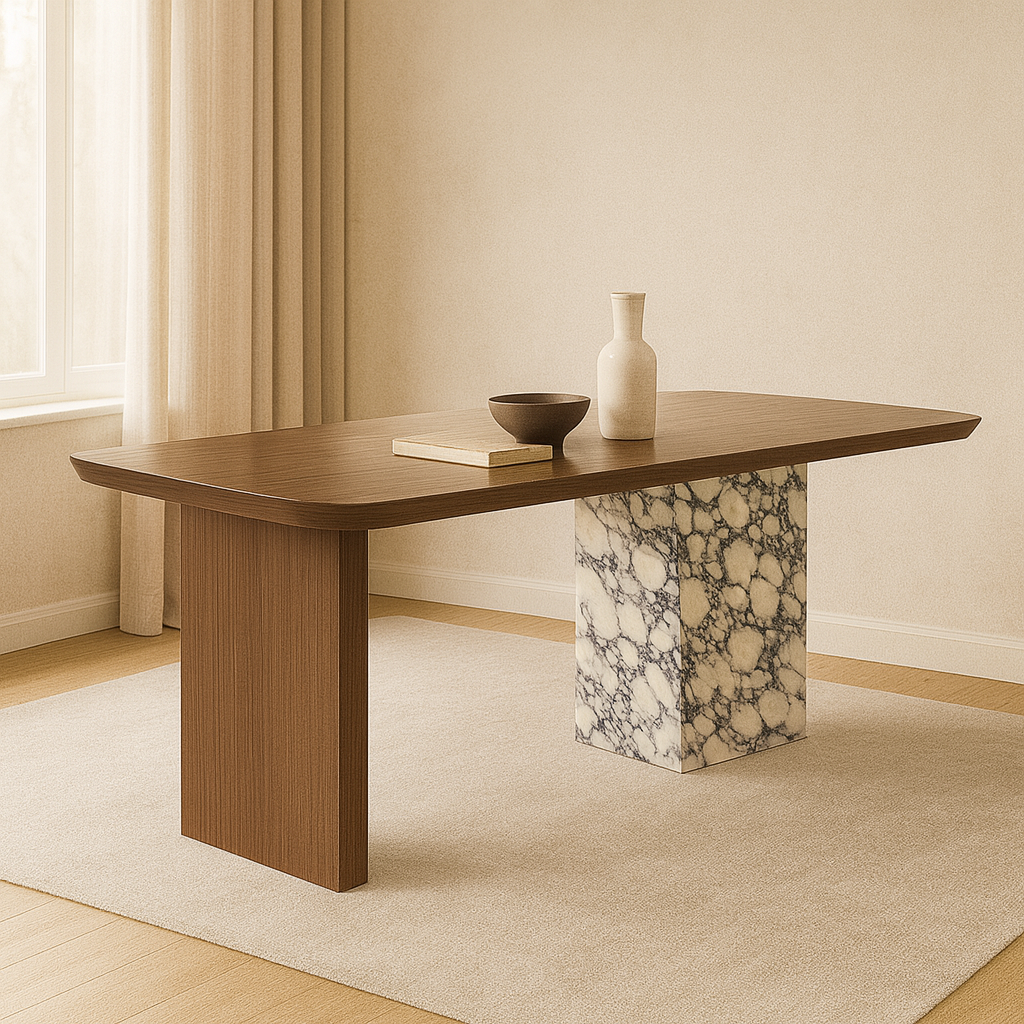 Ein Esstisch mit reduzierter Gestaltung und klarer Silhouette. Ausdruck von handwerklicher Qualität und architektonischer Klarheit.