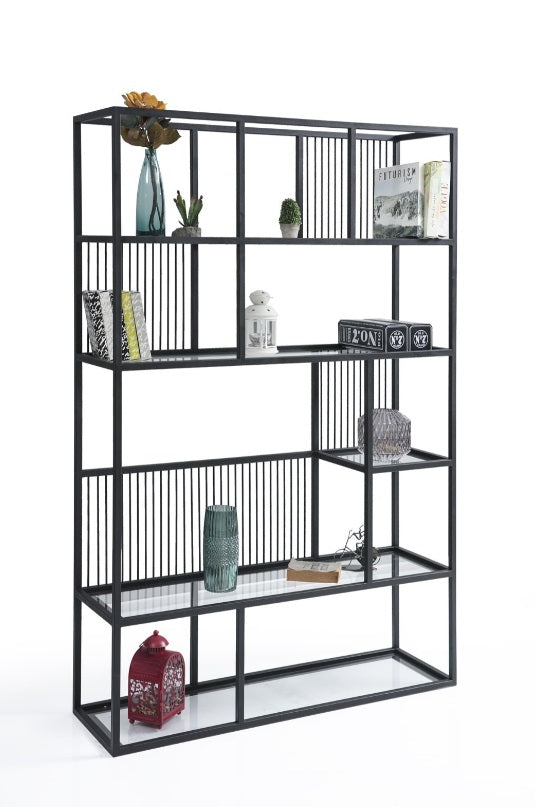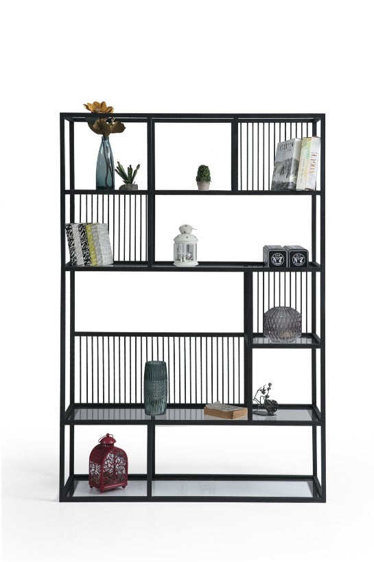 Schwarzes Metallregal mit klarer, luftiger Aufteilung. Filigrane Stäbe bieten Platz für Bücher und Accessoires.