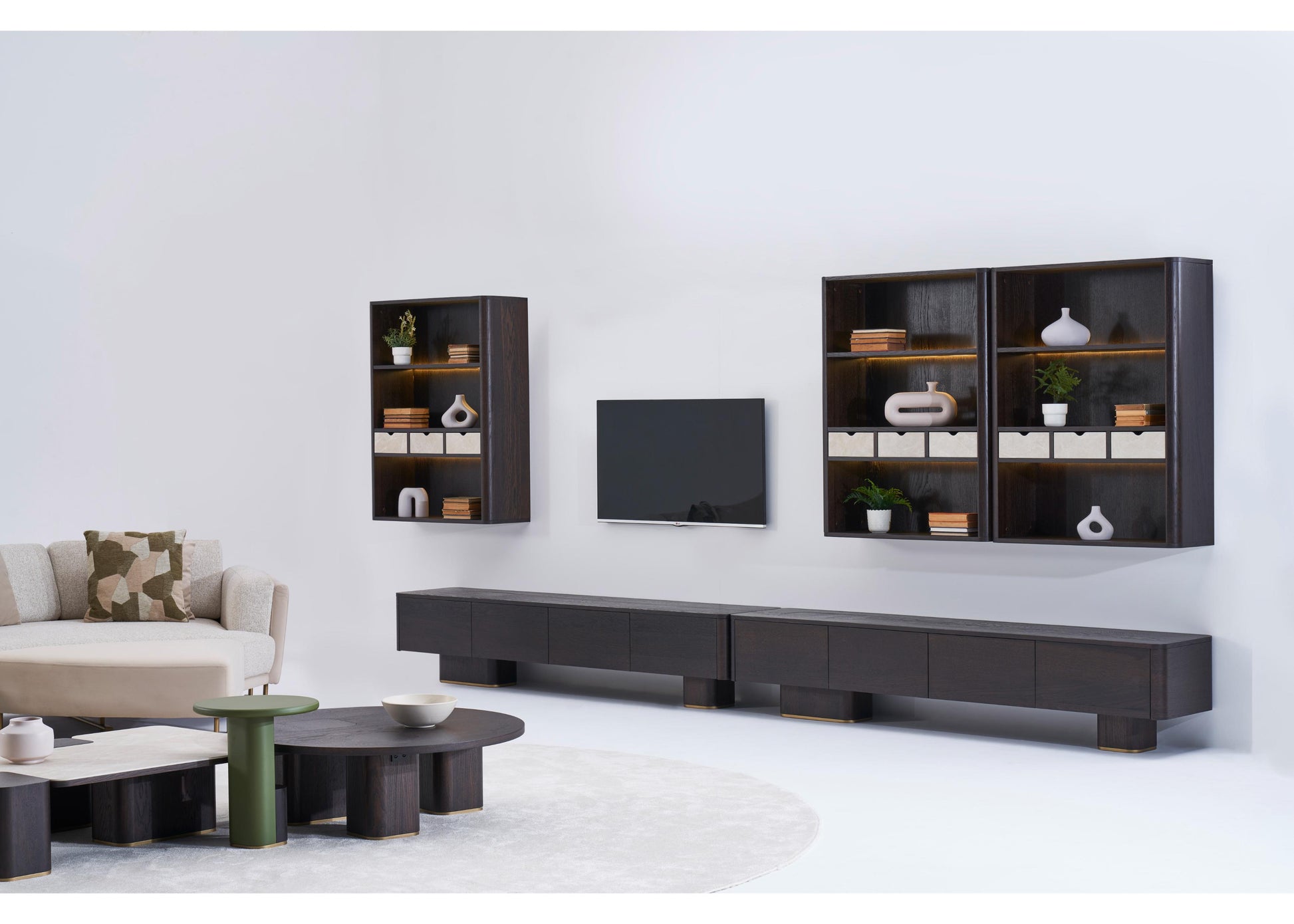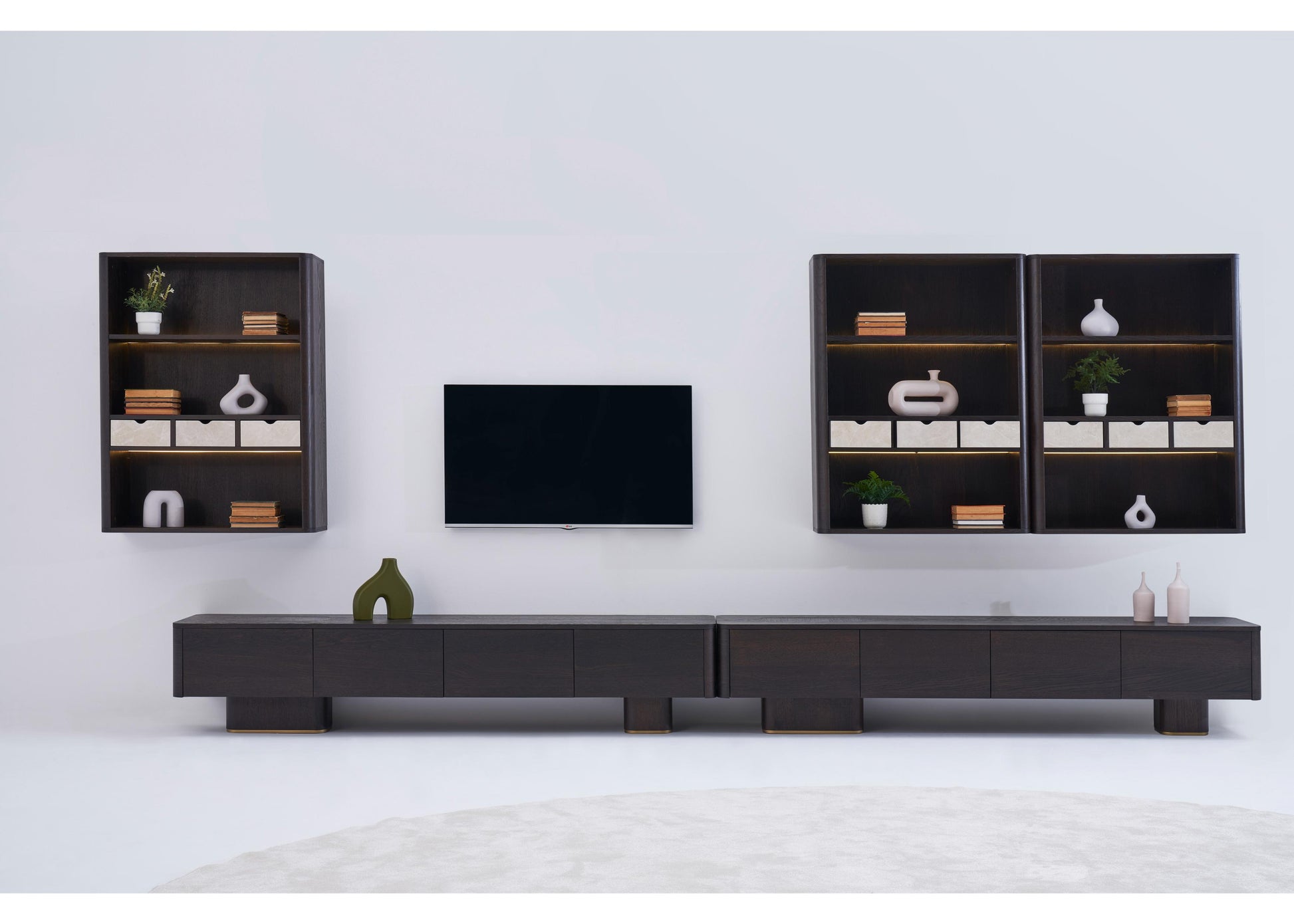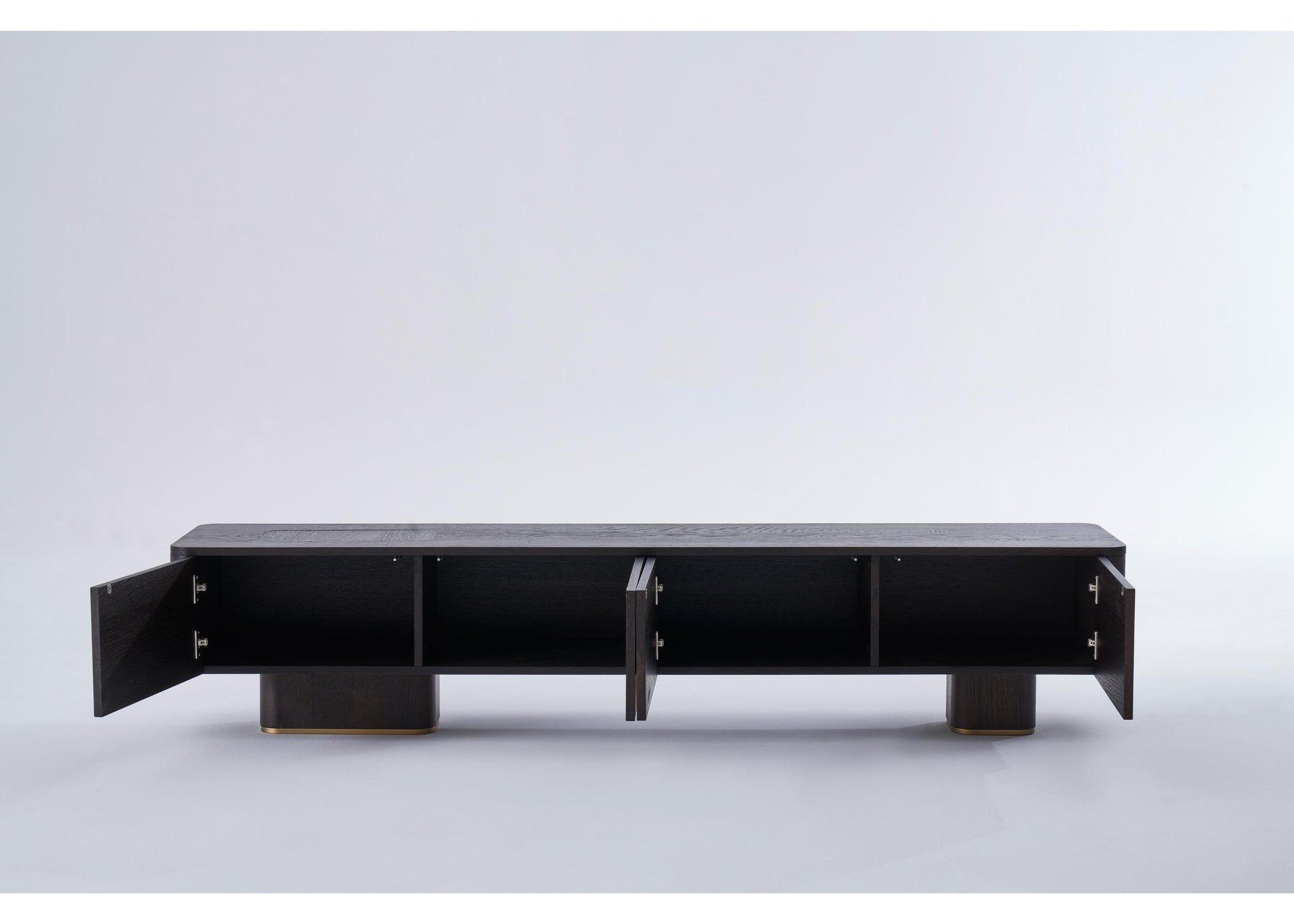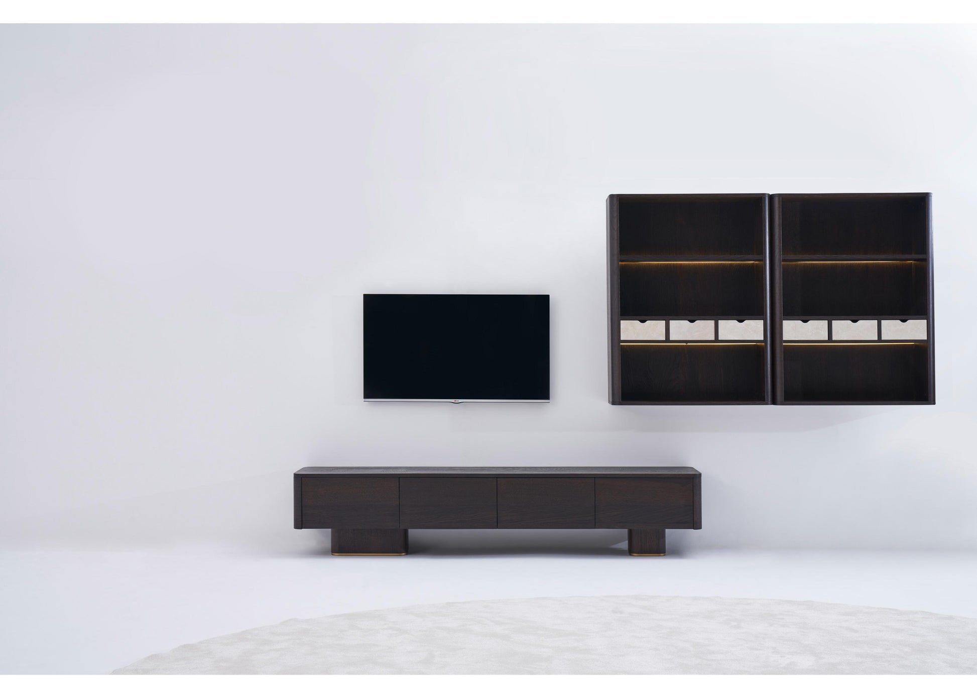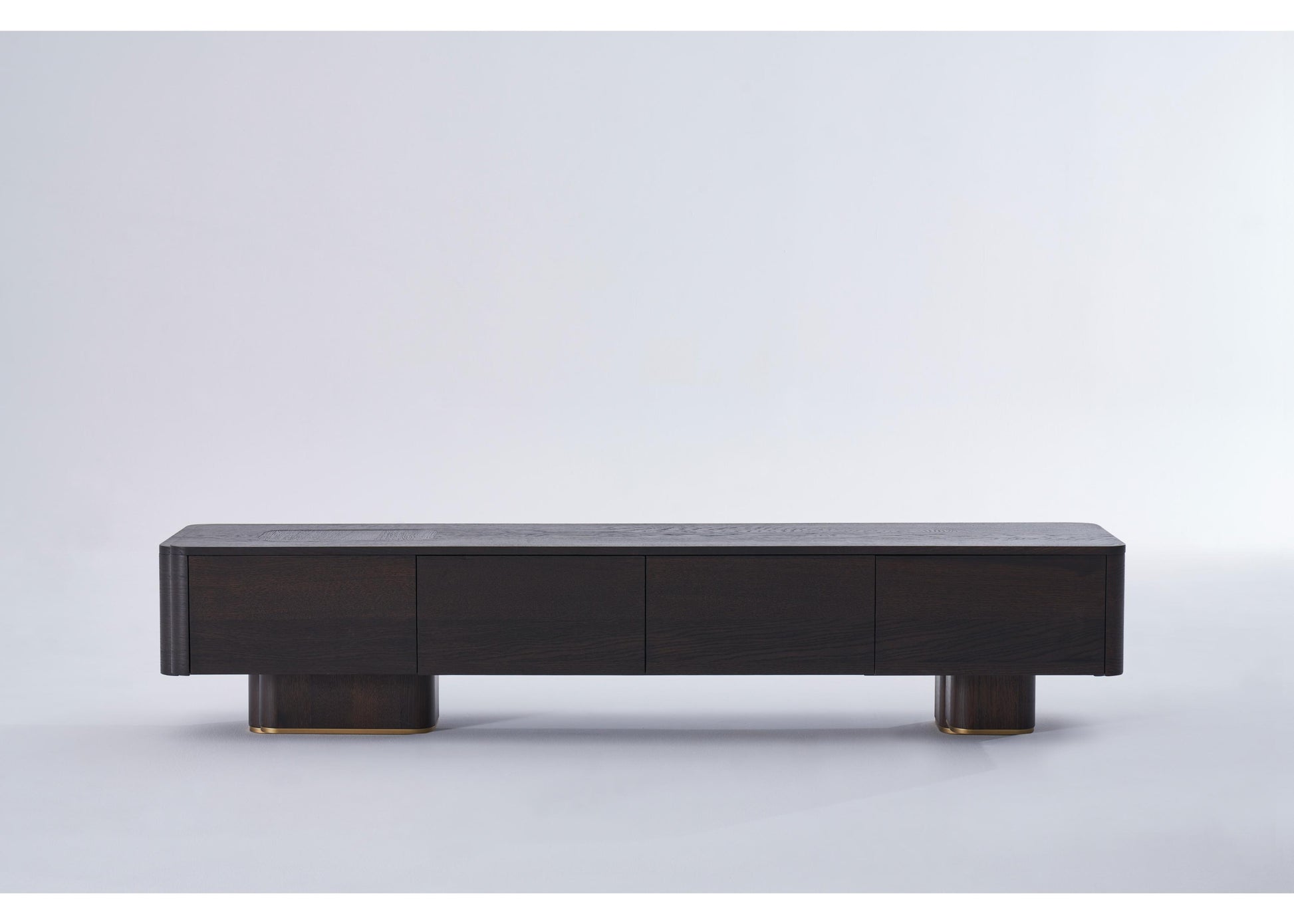 TV-Möbel aus dunkler Eiche mit klarer, architektonischer Linienführung. Strukturiert, funktional und ästhetisch ausgewogen – ideal für moderne Wohnräume. Die ruhige Formensprache unterstreicht die Verbindung von Design und Funktionalität.