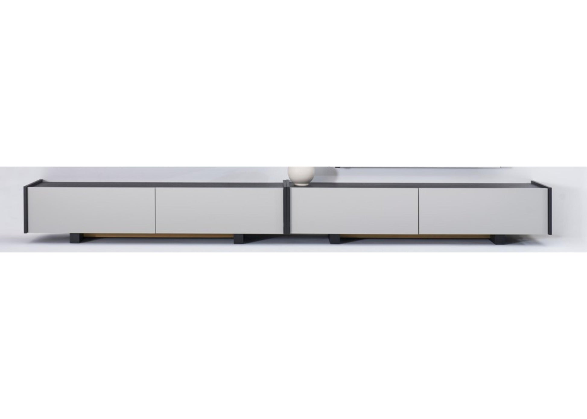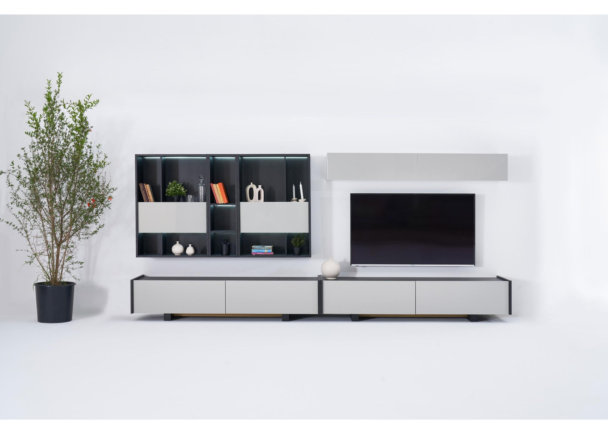 TV-Möbel in Grau mit klarer, architektonischer Linienführung. Strukturiert, funktional und ästhetisch ausgewogen – ideal für moderne Wohnräume. Die ruhige Formensprache unterstreicht die Verbindung von Design und Funktionalität.